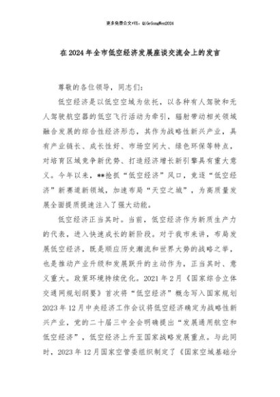 / 【七哥公文】2024年:在2024年全市低空经济发展座谈交流会上的发言+更多免费公文+VX:QiGeGongWen2024