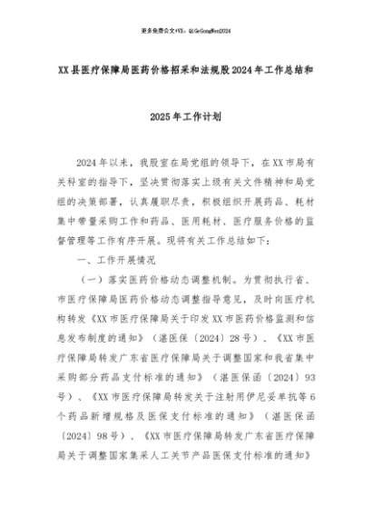 【七哥公文】2024年:XX县医疗保障局医药价格招采和法规股2024年工作总结和2025年工作计划+更多免费公文+VX:QiGeGongWen2024