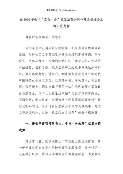 【七哥公文】2024年:在2024年全市“五位一体”社区治理共同体建设推进会上的汇报发言+更多免费公文+VX:QiGeGongWen2024
