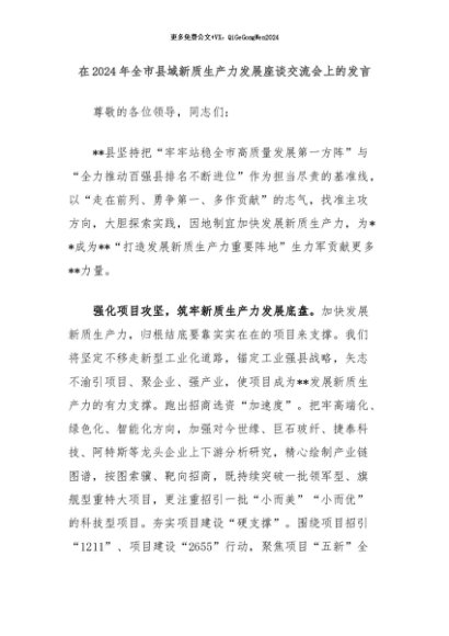 【七哥公文】2024年:在2024年全市县域新质生产力发展座谈交流会上的发言+更多免费公文+VX:QiGeGongWen2024