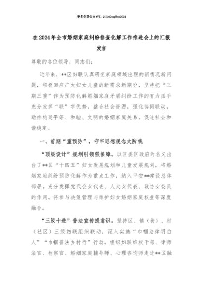 【七哥公文】2024年:在2024年全市婚姻家庭纠纷排查化解工作推进会上的汇报发言+更多免费公文+VX:QiGeGongWen2024