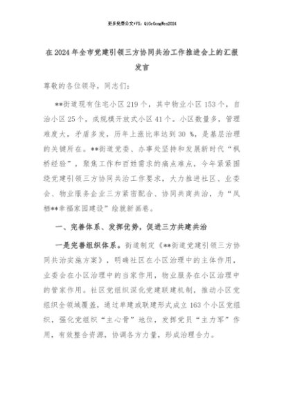 【七哥公文】2024年:在2024年全市党建引领三方协同共治工作推进会上的汇报发言+更多免费公文+VX:QiGeGongWen2024