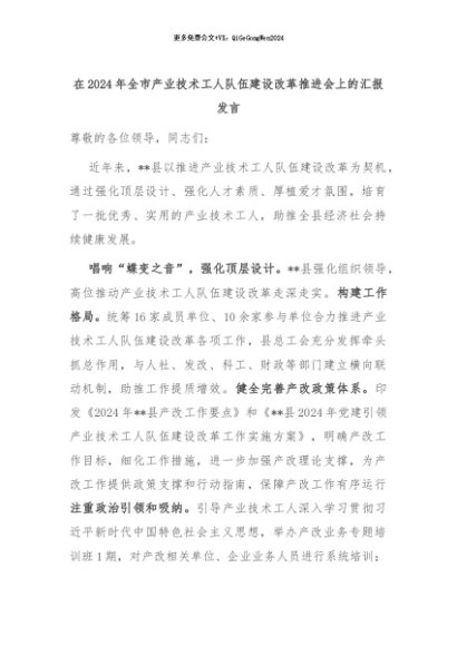 【七哥公文】2024年:在2024年全市产业技术工人队伍建设改革推进会上的汇报发言+更多免费公文+VX:QiGeGongWen2024