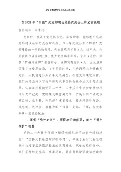 【七哥公文】2024年:在2024年“四强”党支部建设经验交流会上的发言提纲+更多免费公文+VX:QiGeGongWen2024