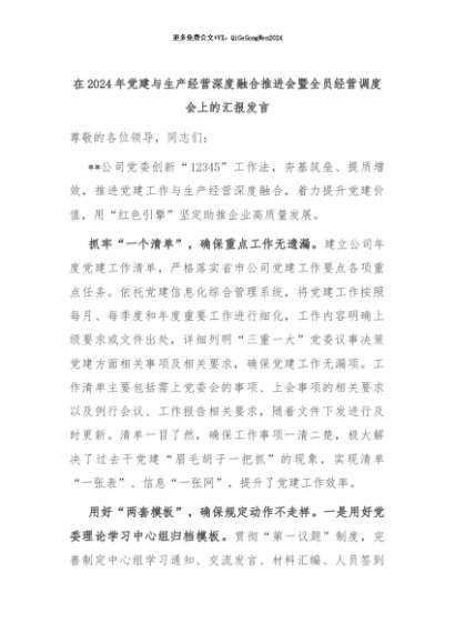 【七哥公文】2024年:在2024年党建与生产经营深度融合推进会暨全员经营调度会上的汇报发言+更多免费公文+VX:QiGeGongWen2024
