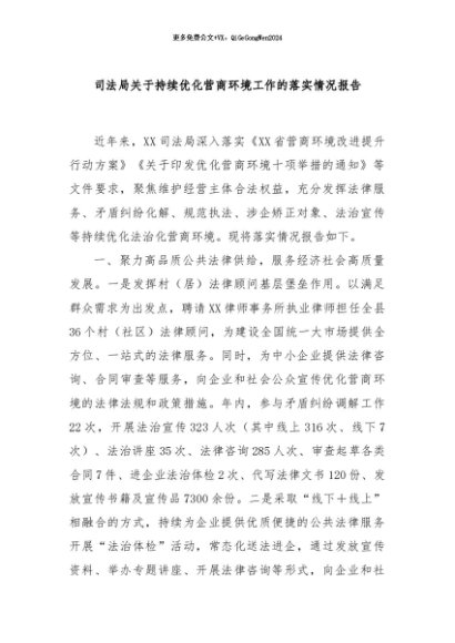 / 【七哥公文】2024年:司法局关于持续优化营商环境工作的落实情况报告+更多免费公文+VX:QiGeGongWen2024