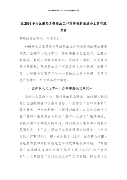 【七哥公文】2024年:在2024年全区基层思想政治工作改革创新推进会上的交流发言+更多免费公文+VX:QiGeGongWen2024