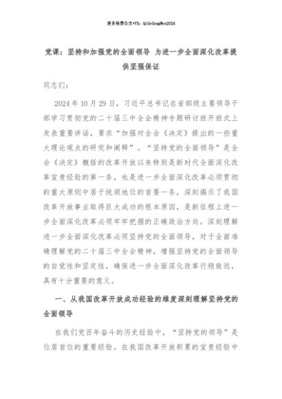【七哥公文】2024年:党课:坚持和加强党的全面领导 为进一步全面深化改革提供坚强保证+更多免费公文+VX:QiGeGongWen2024