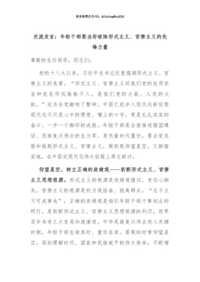 【七哥公文】2024年:交流发言:年轻干部要当好破除形式主义、官僚主义的先锋力量+更多免费公文+VX:QiGeGongWen2024