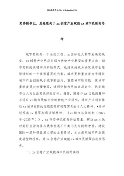 【七哥公文】2024年:党委副书记、总经理关于xx创意产业赋能xx城市更新的思考+更多免费公文+VX:QiGeGongWen2024