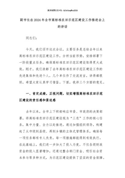 【七哥公文】2024年:副市长在2024年全市高标准农田示范区建设工作推进会上的讲话+更多免费公文+VX:QiGeGongWen2024