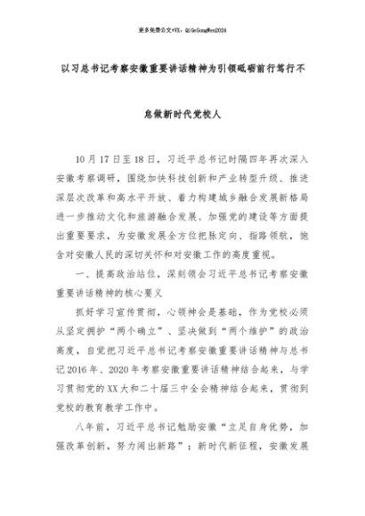 【七哥公文】2024年:以习总书记考察安徽重要讲话精神为引领砥砺前行笃行不怠做新时代党校人+更多免费公文+VX:QiGeGongWen2024