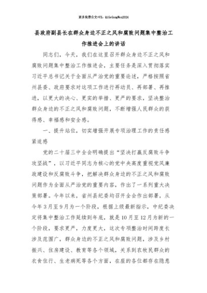 【七哥公文】2024年:县政府副县长在群众身边不正之风和腐败问题集中整治工作推进会上的讲话+更多免费公文+VX:QiGeGongWen2024