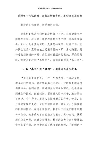 / 【七哥公文】2024年:驻村第一书记讲稿:念好驻村真字经,答好为民高分卷+更多免费公文+VX:QiGeGongWen2024