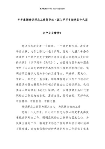 【七哥公文】2024年:牢牢掌握意识形态工作领导权(深入学习贯彻党的十九届六中全会精神)+更多免费公文+VX:QiGeGongWen2024