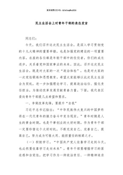 / 【七哥公文】2024年:民主生活会上对青年干部的表态发言+更多免费公文+VX:QiGeGongWen2024