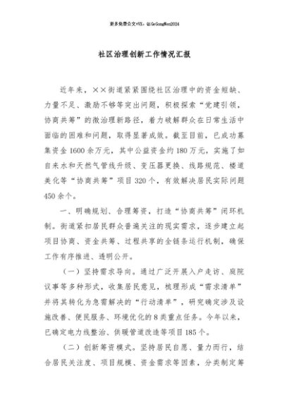 / 【七哥公文】2024年:社区治理创新工作情况汇报+更多免费公文+VX:QiGeGongWen2024