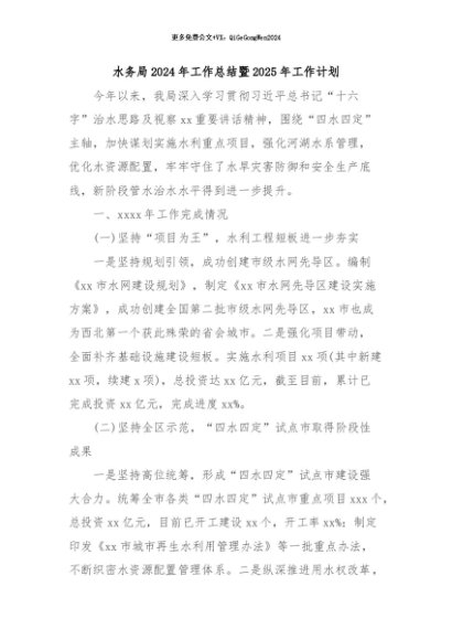 / 【七哥公文】2024年:水务局2024年工作总结暨2025年工作计划+更多免费公文+VX:QiGeGongWen2024