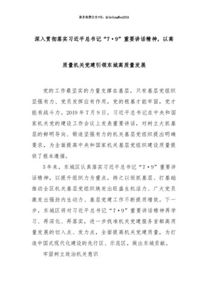 【七哥公文】2024年:深入贯彻落实习近平总书记“7·9”重要讲话精神,以高质量机关党建引领东城高质量发展+更多免费公文+VX:QiGeGongWen2024