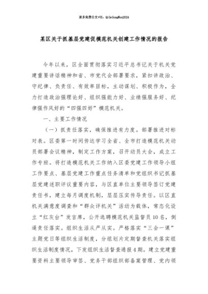 / 【七哥公文】2024年:某区关于抓基层党建促模范机关创建工作情况的报告+更多免费公文+VX:QiGeGongWen2024