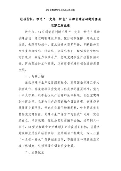 【七哥公文】2024年:经验材料:推进“一支部一特色”品牌创建活动提升基层党建工作成效+更多免费公文+VX:QiGeGongWen2024