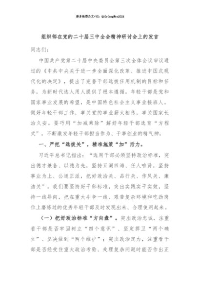 / 【七哥公文】2024年:组织部在党的二十届三中全会精神研讨会上的发言+更多免费公文+VX:QiGeGongWen2024