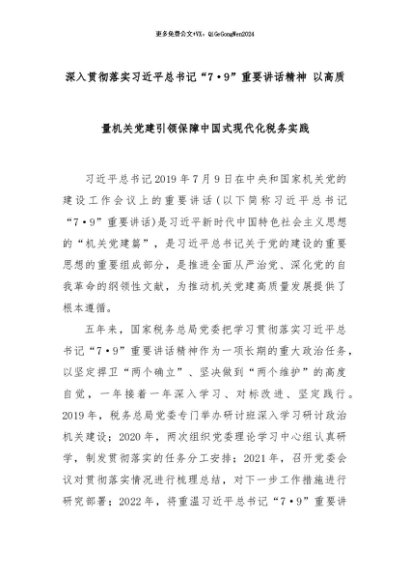 【七哥公文】2024年:深入贯彻落实习近平总书记“7·9”重要讲话精神 以高质量机关党建引领保障中国式现代化税务实践+更多免费公文+VX:QiGeGongWen2024