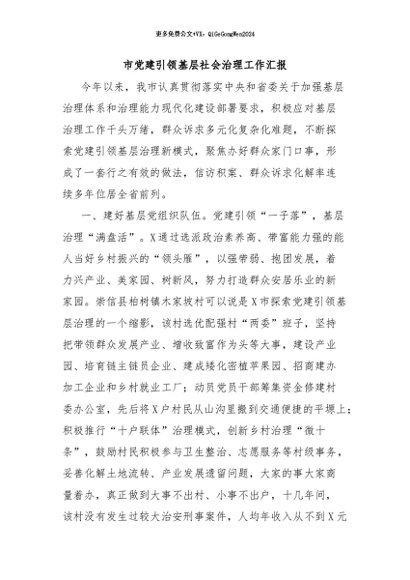 / 【七哥公文】2024年:市党建引领基层社会治理工作汇报+更多免费公文+VX:QiGeGongWen2024