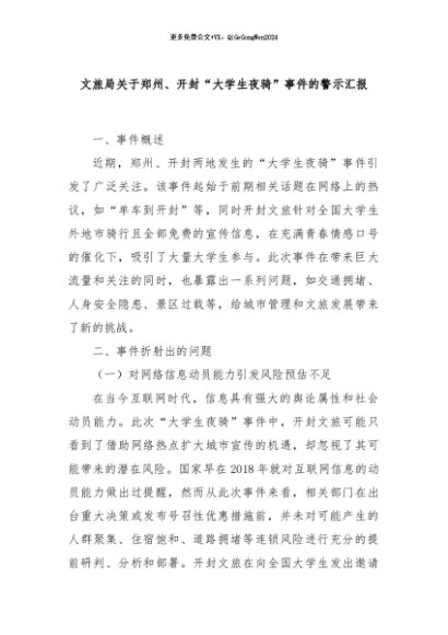 / 【七哥公文】2024年:文旅局关于郑州、开封“大学生夜骑”事件的警示汇报+更多免费公文+VX:QiGeGongWen2024