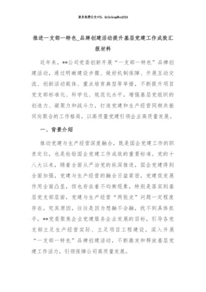 【七哥公文】2024年:推进一支部一特色品牌创建活动提升基层党建工作成效汇报材料+更多免费公文+VX:QiGeGongWen2024