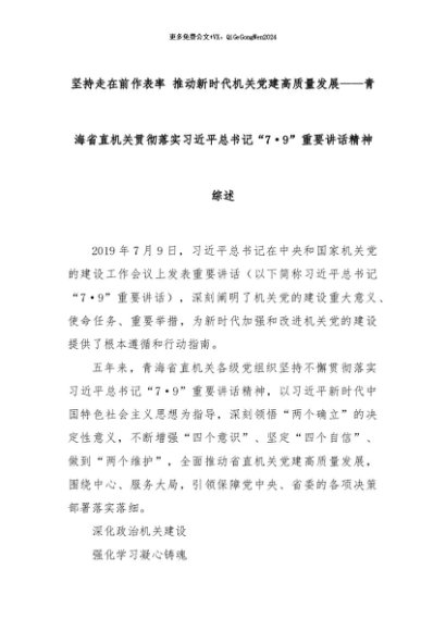 【七哥公文】2024年:坚持走在前作表率 推动新时代机关党建高质量发展——青海省直机关贯彻落实习近平总书记“7·9”重要讲话精神综述+更多免费公文+VX:QiGeGongWen2024