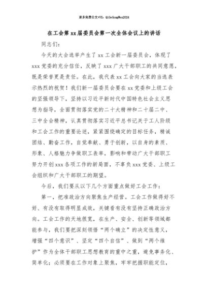 / 【七哥公文】2024年:在工会第xx届委员会第一次全体会议上的讲话+更多免费公文+VX:QiGeGongWen2024