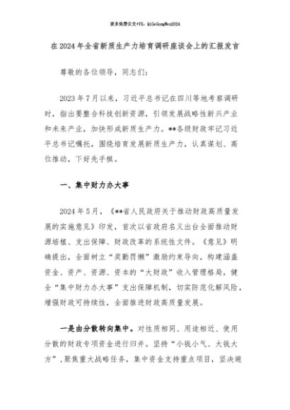【七哥公文】2024年:在2024年全省新质生产力培育调研座谈会上的汇报发言+更多免费公文+VX:QiGeGongWen2024