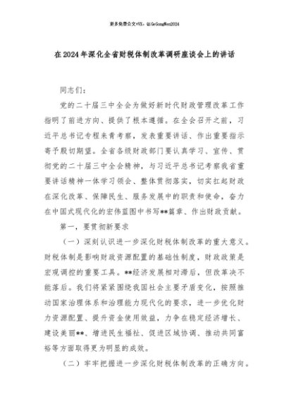 【七哥公文】2024年:在2024年深化全省财税体制改革调研座谈会上的讲话+更多免费公文+VX:QiGeGongWen2024