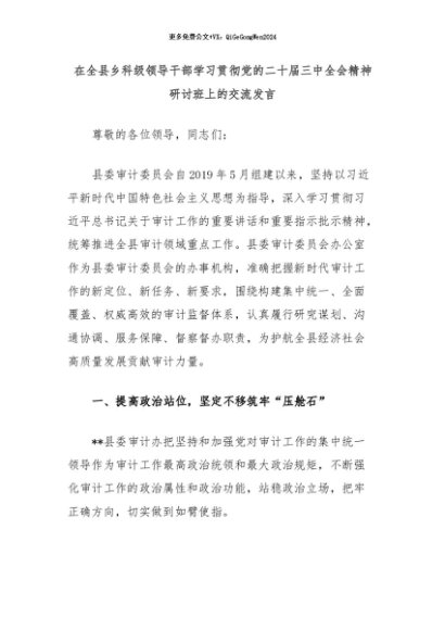 【七哥公文】2024年:在全县乡科级领导干部学习贯彻党的二十届三中全会精神研讨班上的交流发言+更多免费公文+VX:QiGeGongWen2024