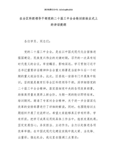 【七哥公文】2024年:在全区科级领导干部党的二十届三中全会轮训班结业式上的讲话提纲+更多免费公文+VX:QiGeGongWen2024