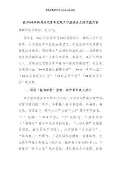 【七哥公文】2024年:在2024年街道促进青年发展工作座谈会上的交流发言+更多免费公文+VX:QiGeGongWen2024