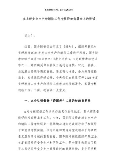 / 【七哥公文】2024年:在上级安全生产和消防工作考核迎检部署会上的讲话+更多免费公文+VX:QiGeGongWen2024