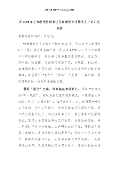 【七哥公文】2024年:在2024年全市村党组织书记队伍建设专项推进会上的汇报发言+更多免费公文+VX:QiGeGongWen2024