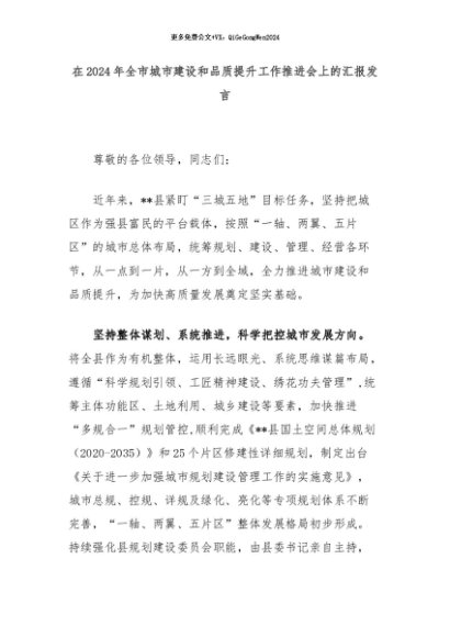 【七哥公文】2024年:在2024年全市城市建设和品质提升工作推进会上的汇报发言+更多免费公文+VX:QiGeGongWen2024