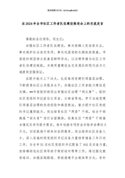 【七哥公文】2024年:在2024年全市社区工作者队伍建设推进会上的交流发言+更多免费公文+VX:QiGeGongWen2024
