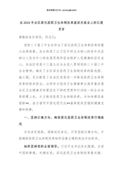 【七哥公文】2024年:在2024年全区深化医药卫生体制改革座谈交流会上的汇报发言+更多免费公文+VX:QiGeGongWen2024