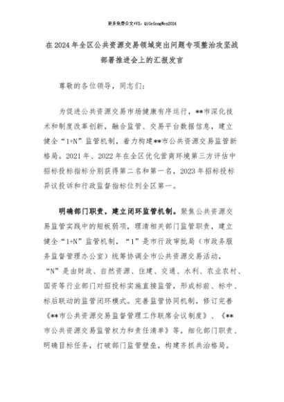 【七哥公文】2024年:在2024年全区公共资源交易领域突出问题专项整治攻坚战部署推进会上的汇报发言+更多免费公文+VX:QiGeGongWen2024