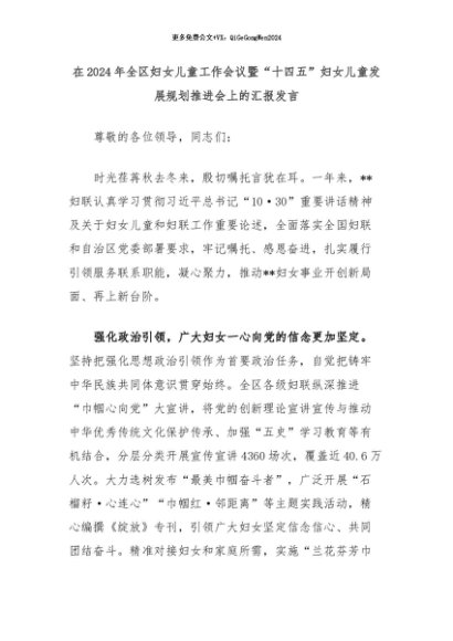 【七哥公文】2024年:在2024年全区妇女儿童工作会议暨“十四五”妇女儿童发展规划推进会上的汇报发言+更多免费公文+VX:QiGeGongWen2024