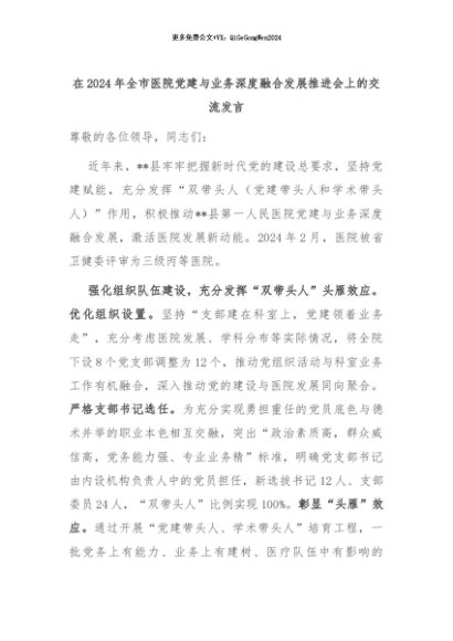 【七哥公文】2024年:在2024年全市医院党建与业务深度融合发展推进会上的交流发言+更多免费公文+VX:QiGeGongWen2024