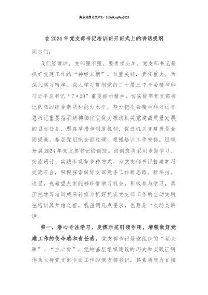 / 【七哥公文】2024年:在2024年党支部书记培训班开班式上的讲话提纲+更多免费公文+VX:QiGeGongWen2024