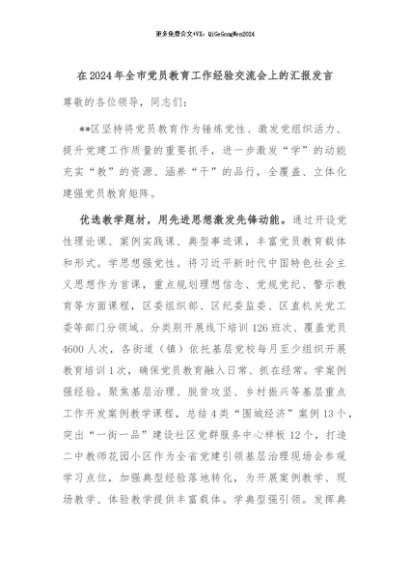 / 【七哥公文】2024年:在2024年全市党员教育工作经验交流会上的汇报发言+更多免费公文+VX:QiGeGongWen2024