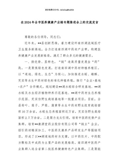 【七哥公文】2024年:在2024年全市医养健康产业链专题推进会上的交流发言+更多免费公文+VX:QiGeGongWen2024