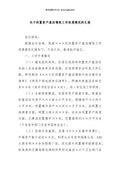 / 【七哥公文】2024年:关于闲置资产盘活增效工作进展情况的汇报+更多免费公文+VX:QiGeGongWen2024