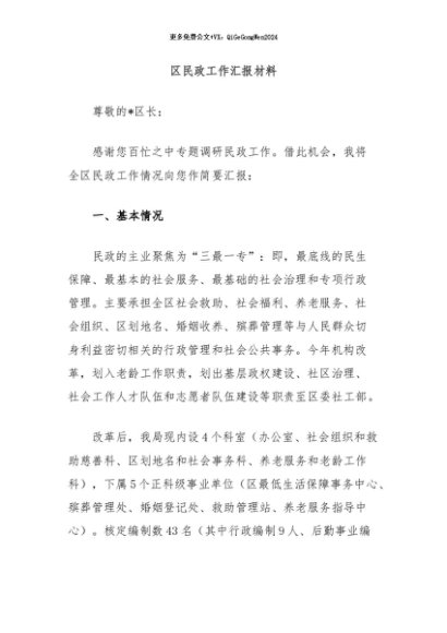 / 【七哥公文】2024年:区民政工作汇报材料+更多免费公文+VX:QiGeGongWen2024